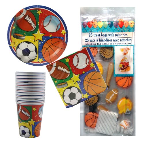 Sports Theme Birthday or Team Party Kit Party Pack Supplies for 12 - Football, Baseball, Soccer, & Basketball, plates, napkins, cups, cello treat bags Features is very good!