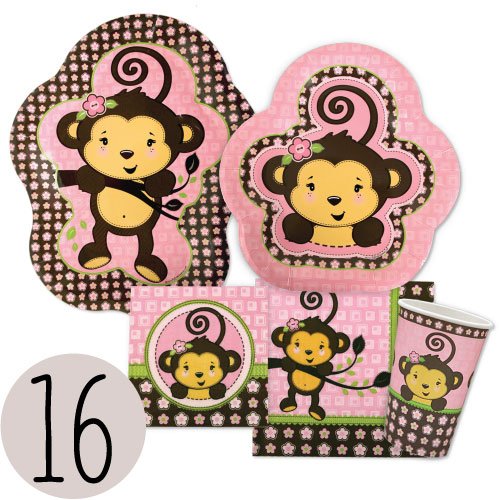 16 Monkey Girl Bundle Perfect Party Pack! You'll receive: 16 dinner plates, 16 dessert plates, 16 luncheon napkins, 16 beverage napkins and 16 cups.
