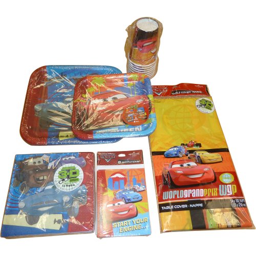 - Lighting McQueen and Tow Mater will guarantee a racing good time with a Disney Cars 2 Deluxe Party Pack For 8 Guests! . This kit includes: This kit includes: 8 invitations, 8 dinner plates, 8 dessert plates, 16 lunch napkins, 8 paper cups, and 1 tablecover.