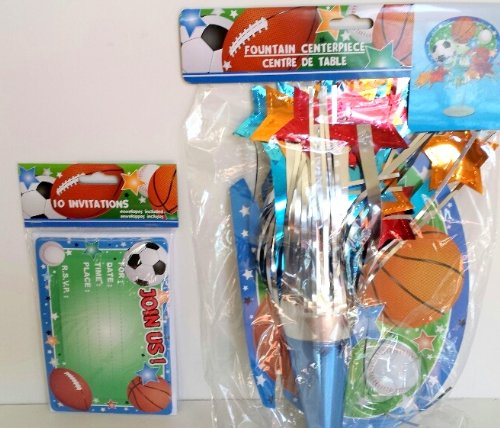 Sports Party Pack - Football, Baseball, Basketball. Soccer. Includes Plates, Napkins, Cups, Invitations, Centerpiece ! Features is very good!
